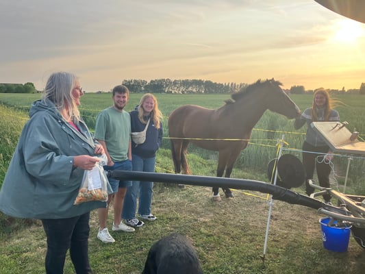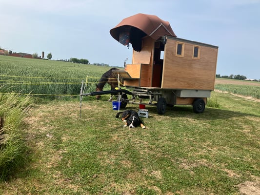 Am 1. Juni, bei eindrücklicher Morgenstimmeng in Richtung Belgien. Wir waren soooo schnell unterwegs auf der grossen Strasse, dass ich die Grenze beinahe übersehen habe. Ich habe mich nur kurz gefreut. Alles ist gepflegt die Häuser sind in einem besserem Zustand als in Frankreich. Es scheint, dass sie wohlhabender sind als in Frankreich. Es sind keine Brachefelder mehr auszumachen, wo ist genügend Gras für meine Worker habe. Doch mit kleinen, schmalen Streifen mit gutem Gras kann ich zufrieden sein. Nun fahren wir in den Sonnenaufgang. Die kleinen Wege und die Stimmung ist Balsam für die Seele. Am Lagerplatz tauchte eine Mutter mit ihrer Tochter auf. Sie haben mich von der Strasse aus gesehen. Die Pferde haben es der Tochter angetan. Das wäre ihr Traum, und frage mich, ob sie Morgen ein Stück mitfahren könne.